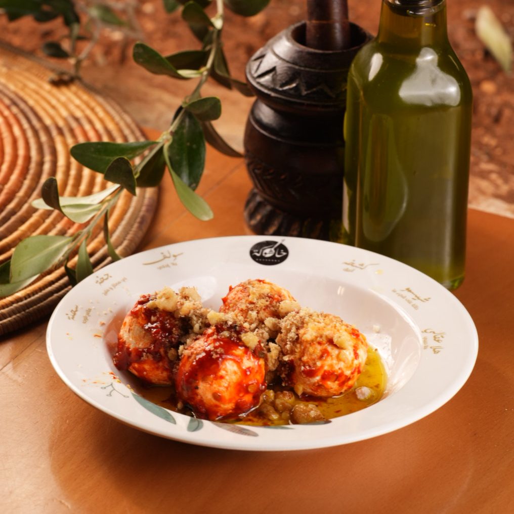 Yalanji, yogurt sauce, tahini, beef, olive oil, pomegranate molasses and nuts